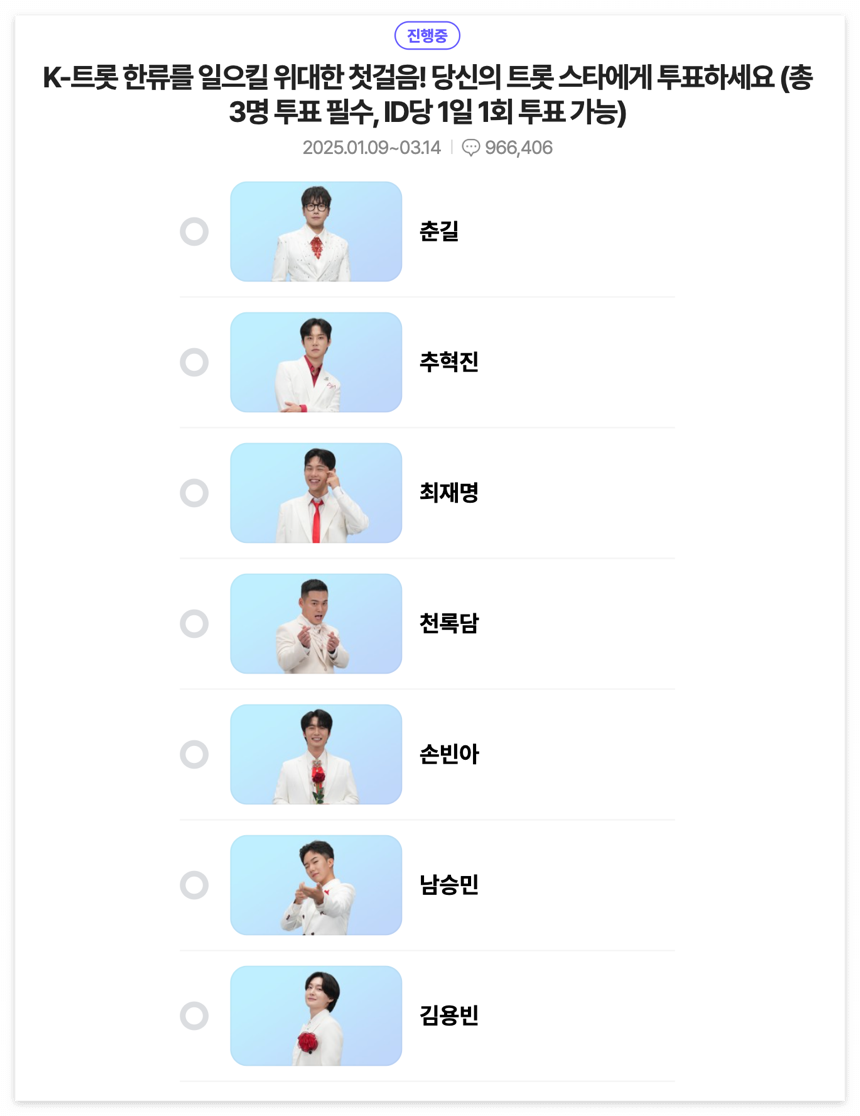 네이버에 '미스터트롯3'을 검색 후 ‘대국민 응원투표’ 페이지에 접속해 하루에 한 번, 응원하는 가수 3명을 선택해 투표할 수 있습니다.